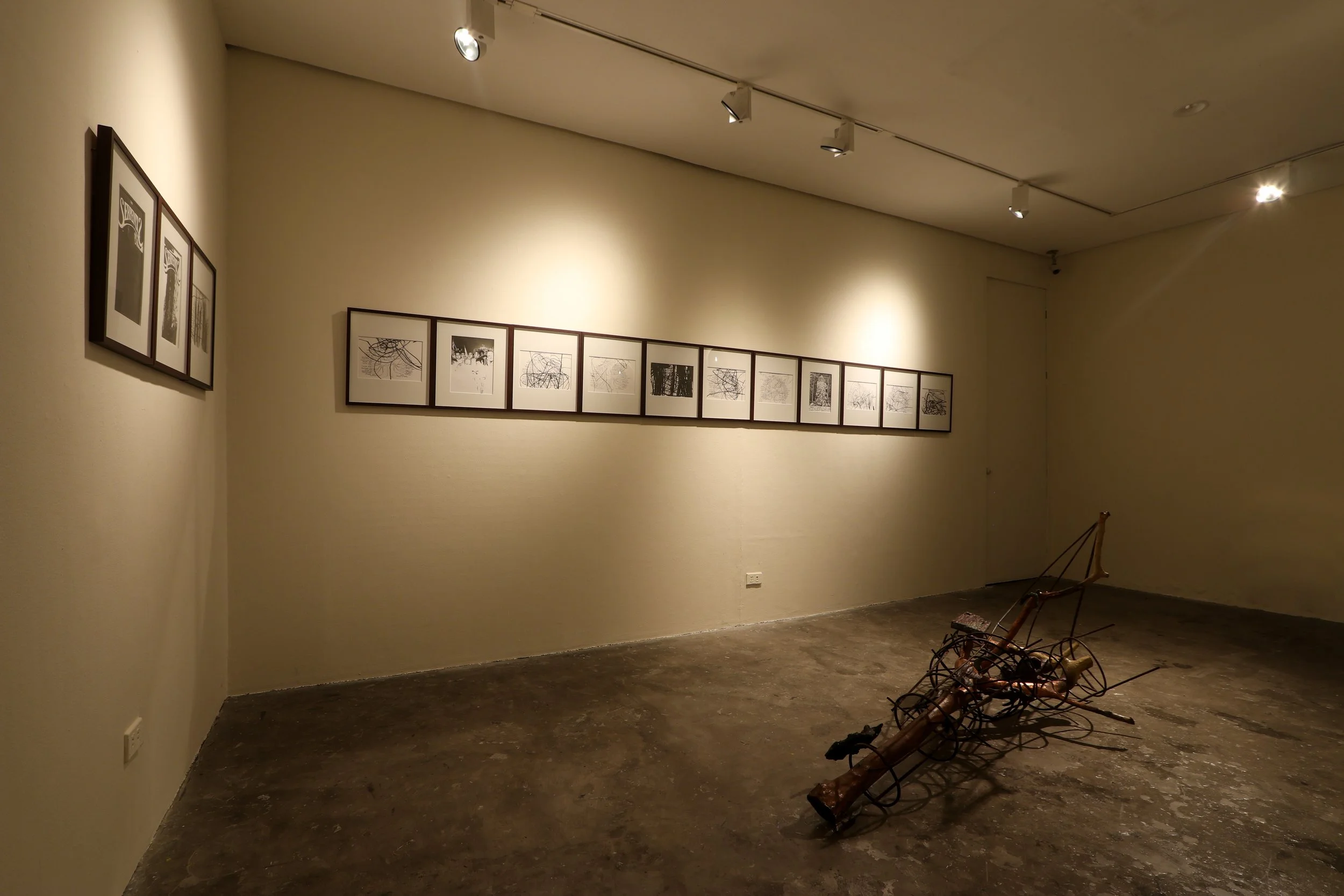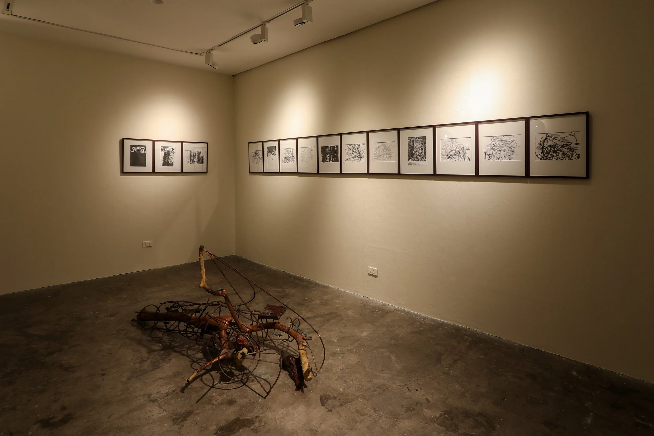 Collaborative object-works, as well as drawings and a painting by Zicarelli, are interspersed throughout the exhibition, joining the viewer in witnessing the ritual. An attuned mind’s eye will notice a kind of synchronized soaring in the sculptural display: Aquilizan’s tall sentinels and Zicarelli’s mountainous landscape are both oriented skyward. Of the history of civilization, it has been said that ancient structures point to the sky to bring their makers closer to enlightenment. A consonance can be made along the lines of aspiration, but towards different spiritual aims. In the case of the artists, a clearer understanding of their respective callings, one that only reveals itself through the ritual of practicing with others. In undermining the physical confines of the exhibition space, and deferring to the skies—or the suns contained within it, an upspring in temperament may be had if the viewer is so inclined.