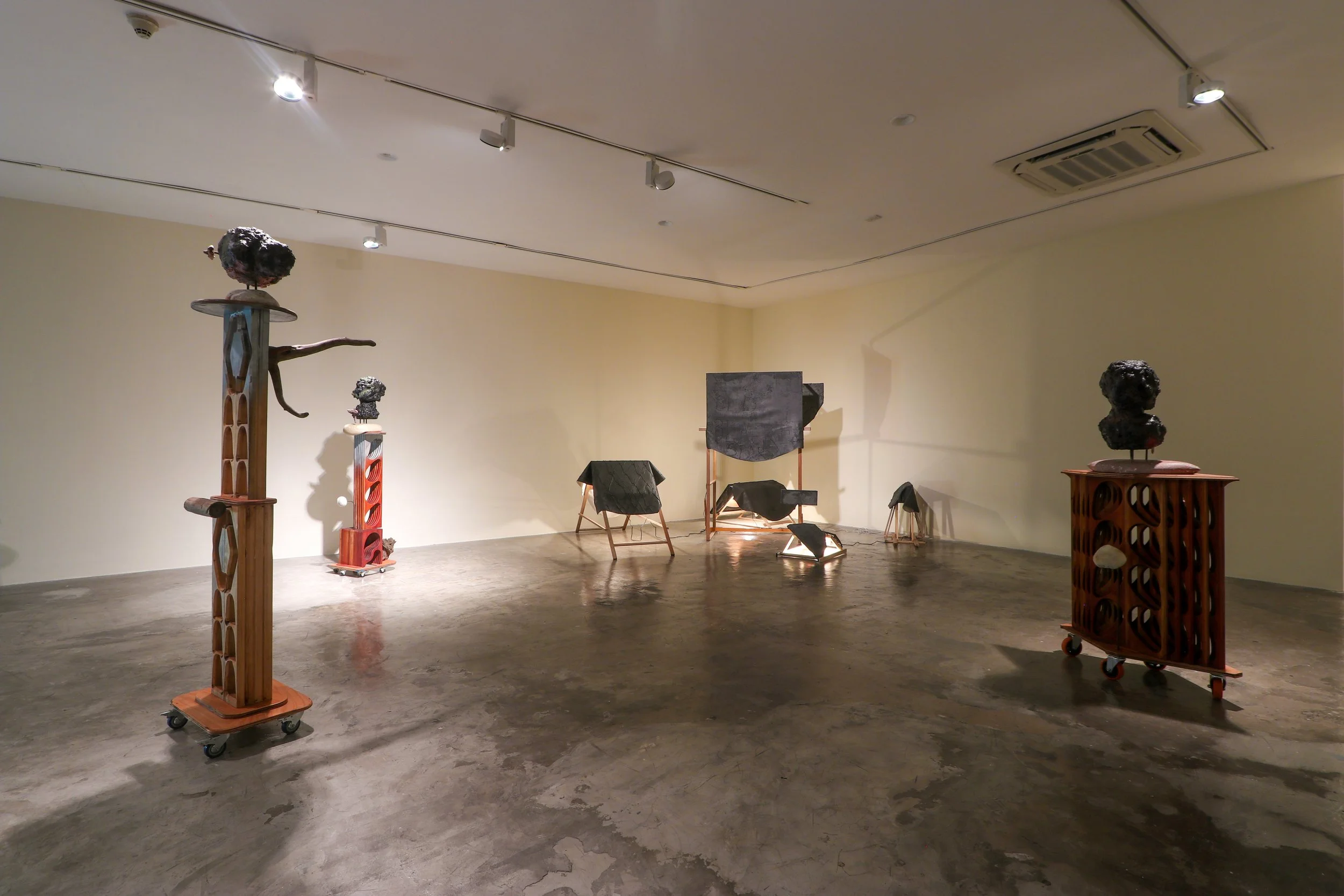 Rising and setting in this world-to-be is not one but two suns, making time move differently here. Sculpture, within it a peak objecthood that best embodies the artists’ histories with form and material, is at the core. Departing from assemblage, Aquilizan returns to his training in sculpture with classical techniques applied to various components. Some traditional, some found, he manipulates plaster, cement, and wood with precision and playfulness, resulting in towering gestures of geometric pattern and organic silhouette. Something about these sculptures are more like structures, perhaps in the way the wooden foundations can be taken as projections from the artist’s affinity with design. Zicarelli, despite his longer history with paper and canvas, is present in a similar manner: by way of structure. Wooden cutouts of the Sierra Madre that often feature in his paintings as frames are transfigured into abstract scaffolds, at times readymade, signaling a recurring impulse to carry rather than carve. Lifted from the ground and given new form are fragments of old paintings and found practice statues, their attachments seemingly tentative, inviting the possibility to witness them in the process of becoming.